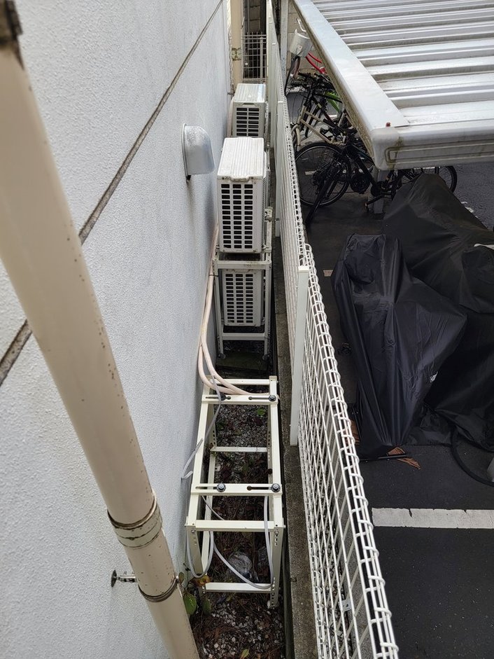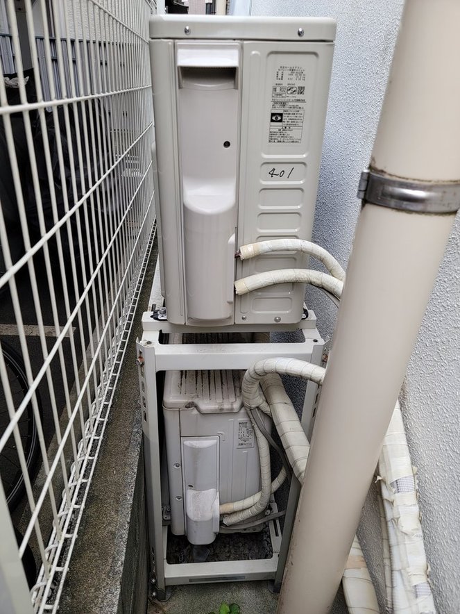 敷地の空きに新たに2段置き架台を置き、上段に新規室外機を設置します。
